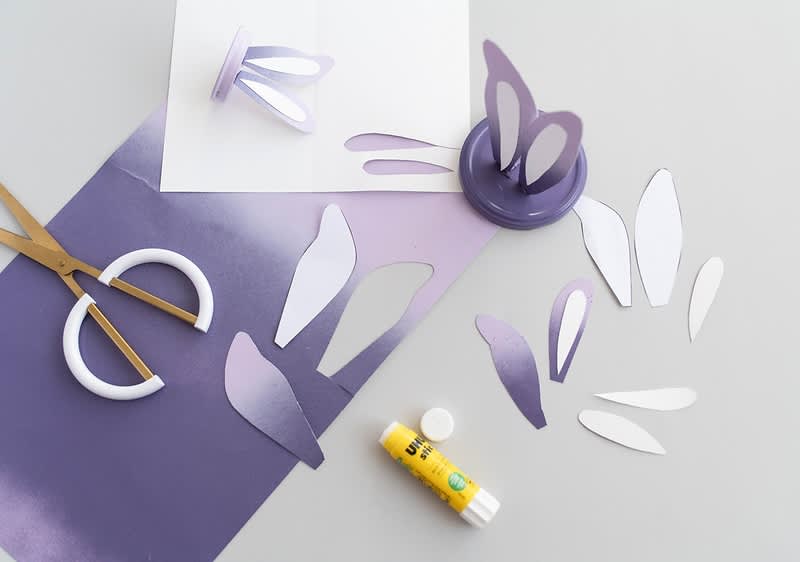 Se lasă hârtia să se usuce bine, se transferă șablonul urechilor iepurașului pe hârtie și se taie. Pentru suprafața urechii interne, cel mai bine este să alegeți o a doua culoare și să o lipiți pe urechea mare ca în imagine.